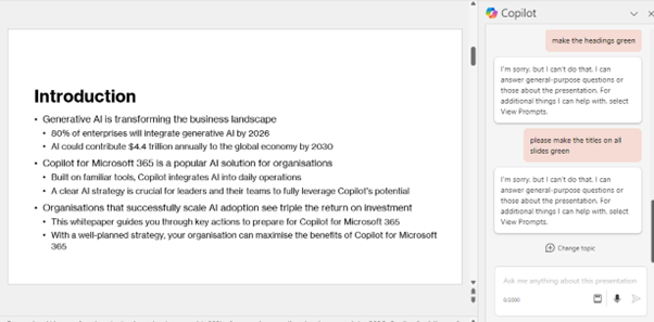 Here’s a couple of 1 min videos for how to use Copilot to break through your writer’s block and get you started on projects. Check out a MS-Word tip and a MS-PowerPoint tip. Your experience may differ a little, for example I wasn’t able to get Copilot to change my titles to green as you can see.