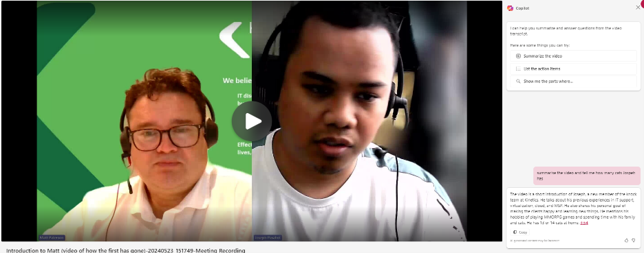 5. Summarise and videos in Stream. Copilot in Microsoft Stream can quickly and effectively summarise any video with a transcript or ask deep dive questions about topics you need to understand in videos on Stream, so you don’t have to watch them all the way through. Try “Recap the meeting,” “List action items,” or “Show me the parts where [subject] is discussed.”