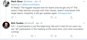 1. You can now have 9 video callers on the screen at once. This will be one of the most popular features in the next update of Teams. For now, you turn it on manually, and in time this will become the default. Just be aware that the more video feeds, the more internet performance is required. Microsoft say that it will automatically adjust the number of video feeds to optimise your experience, but we’re yet to use this enough to get a clear assessment of that. The worst case scenario is that you have to turn out the number of feeds for some meetings – that seems perfectly acceptable. There is more coming, with a tweet from Rish Tandon (Microsoft CVP Engineering for Microsoft Teams) promised they will soon let us see ALL participants in the meeting at the same time .