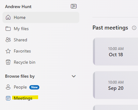 Now you can see your meeting content in one easy view,  grouped by meeting in chronological order.  It includes content from invites, chats and recordings.